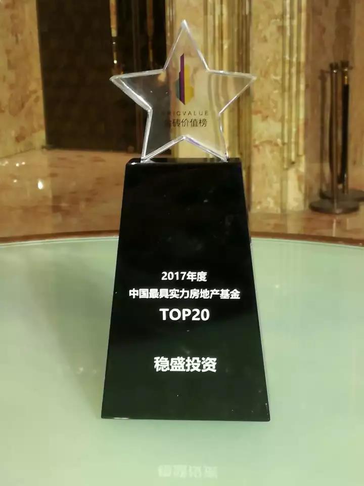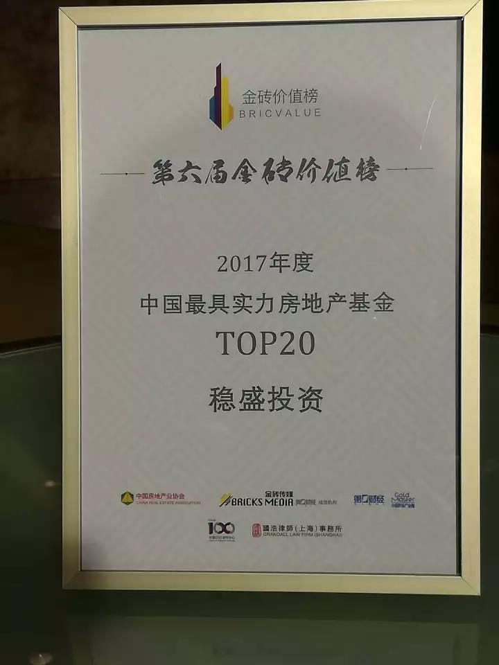 The trophy and certificate of “One of Top 20 Real Estate Funds in China in 2017”