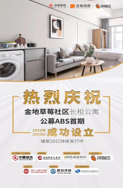 On March 19, 2020, "Gemdale Strongberry Public Offering ABS Phase 1", with WINS Investment as the general coordinator and transaction consultant, and China Capital as the plan manager and lead underwriter, was successfully issued on Shanghai Stock Exchange with the issuance scale of RMB 111 million yuan, including the priority scale of RMB 110 million, with a total period of 3+3+3 years, the rating of AAA, and the issuance interest rate of 4.5%, and many investors have oversubscribed it. Gemdale Strongberry Public Offering ABS Project has a shelf scale of RMB 2 billion, with its issuance in progress. This is the first " asset- lighturban renewal" asset securitization product of long-term rental apartments on the Shanghai Stock Exchange.